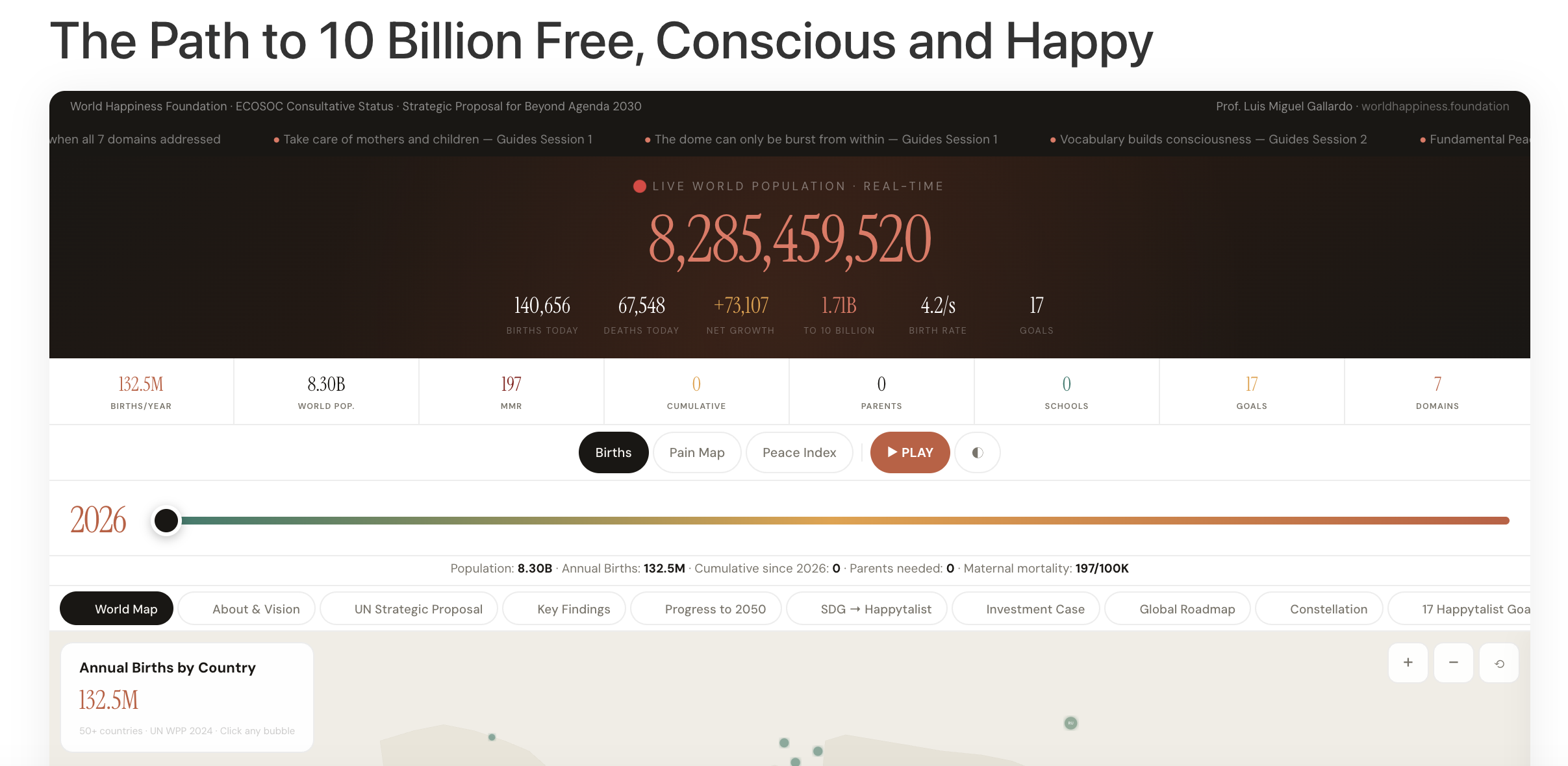 The World Happiness Foundation has built a platform to answer this question with precision, and a strategy to change the answer. The 10 Billion Free, Conscious & Happy platform is the world’s first pan-systemic intelligence tool that layers United Nations birth projections, suffering indices from our Global Pain & Trauma Map (GPTM), abundance-based development goals (the 17 Happytalist Goals), consciousness insights from the Guides’ Collective Wisdom Sessions, and delivery infrastructure through five Ecosystems of Happiness — all in a single, interactive experience available to every government, institution, and citizen on Earth.