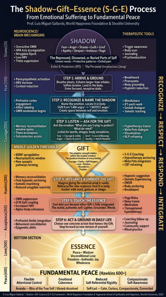 The paper details several evidence-based pathways for moving from shadow to peace. Central among them is the Shadow-Gift-Essence (S-G-E) process — a three-step framework I’ve developed that integrates elements of Jungian shadow work, Internal Family Systems, and contemplative practice: